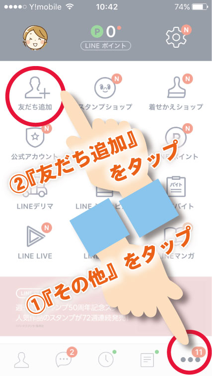 右下の「その他」をタップし、左上に「友達追加」がでます。