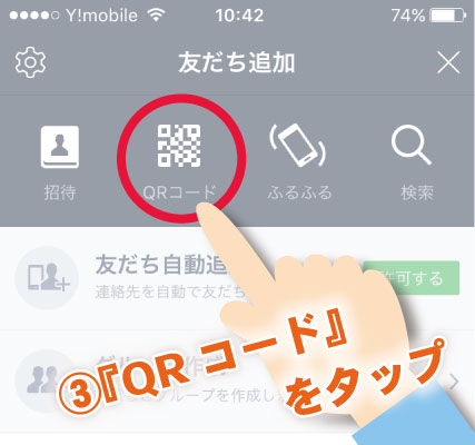 その友達追加をタップしていただくと、上欄に「QRコード」が出ますのでタップして下さい。