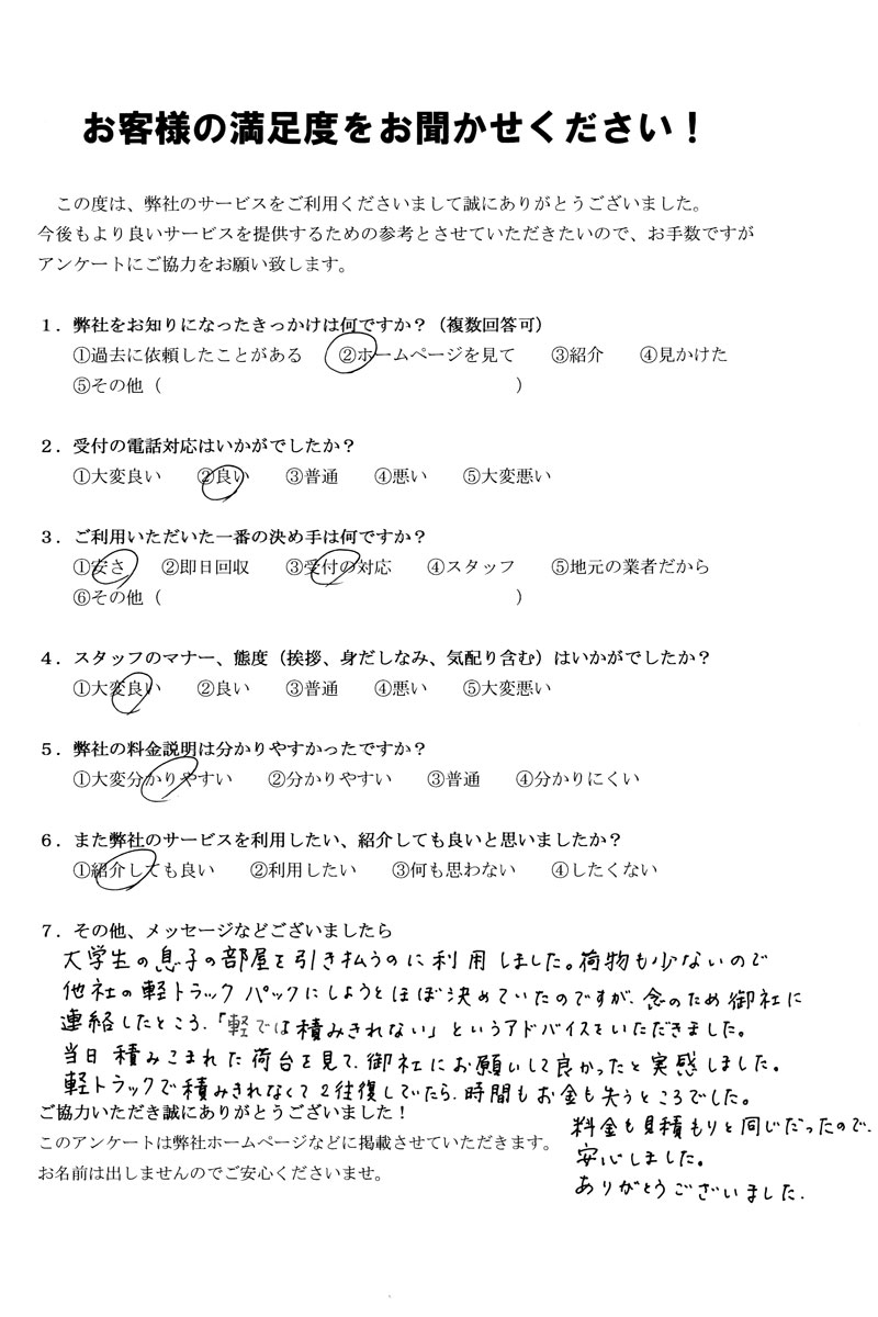 荷物も少ないので他社の軽トラックパックにしようとほぼ決めていたのですが、念のために御社に電話したところ「軽では積みきれないとアドバイスをいただきました。